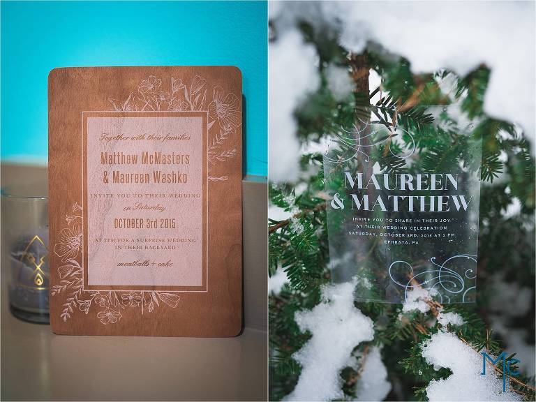 Left: Wooden Invite : For the rustic nature loving couple these are perfect and simply stated. It has a nice thickness too it without it being heavy. Its a unique way to surprise guests and a lovely keepsake. Right: Clear Invite : Beautiful and can apply to any taste. It also comes in frosted.