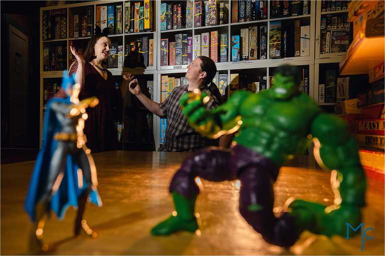 We had a blast with them in their element at Tiki Board & Games playing with Hulk & Batgirl. I’ll also mention this one is a special one for me (Mo) Roni was my band partner hitting our mallets to the marimba in high school and Tiki Games is in our hometown of Woodbury NJ. It was great catching up and having a new experience to photograph in. Can’t wait for what antics the wedding brings!!