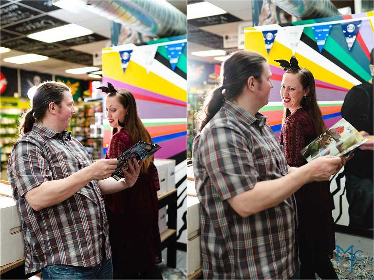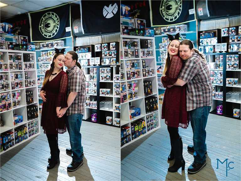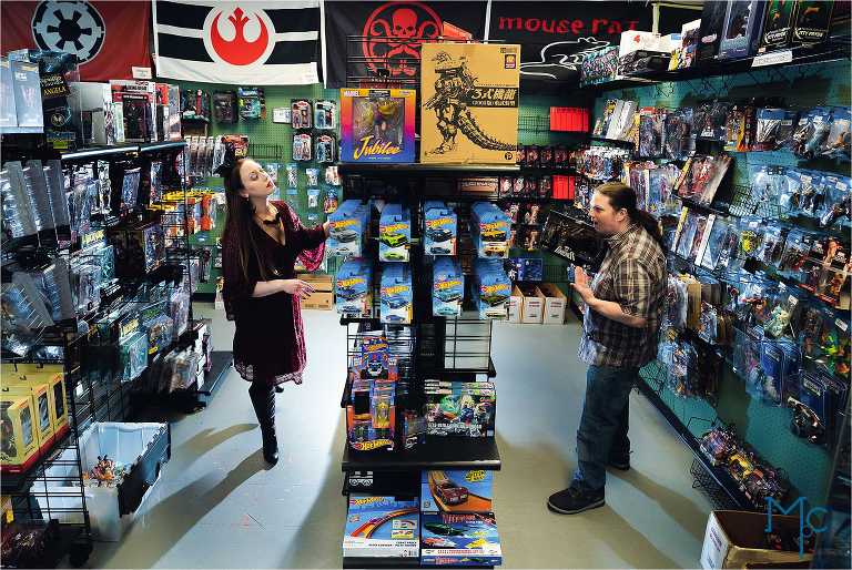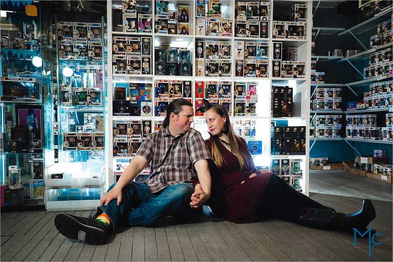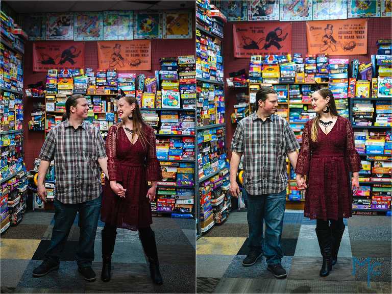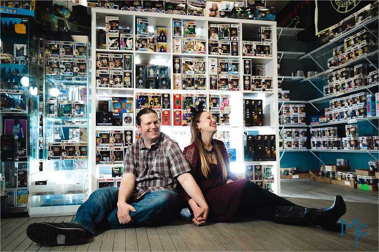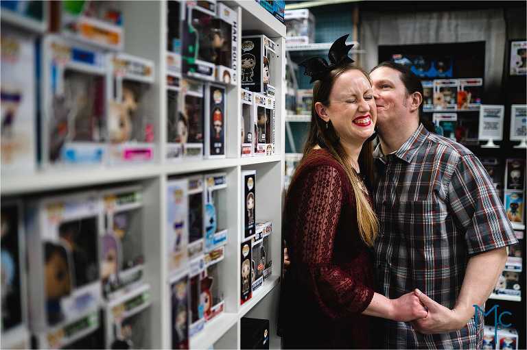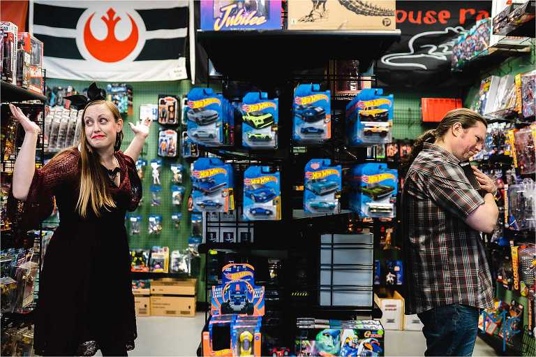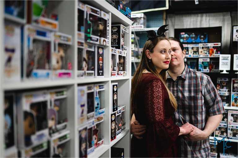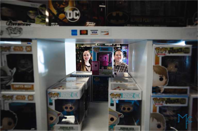 Matt & Roni’s story begins with friends, puns, and pubs. Initially meeting and not making the biggest impression, they still had mutual friends and then started working together which made it hard for them to miss each other. Through this constant interaction, they developed feelings and a Funko Pop collection for the ages (hence having their session at a game shop:). Matt proposed in front of both families at a dinner leaving Roni floored and happily engaged with a BEAUTIFUL amethyst ring.