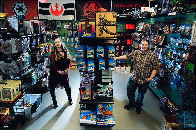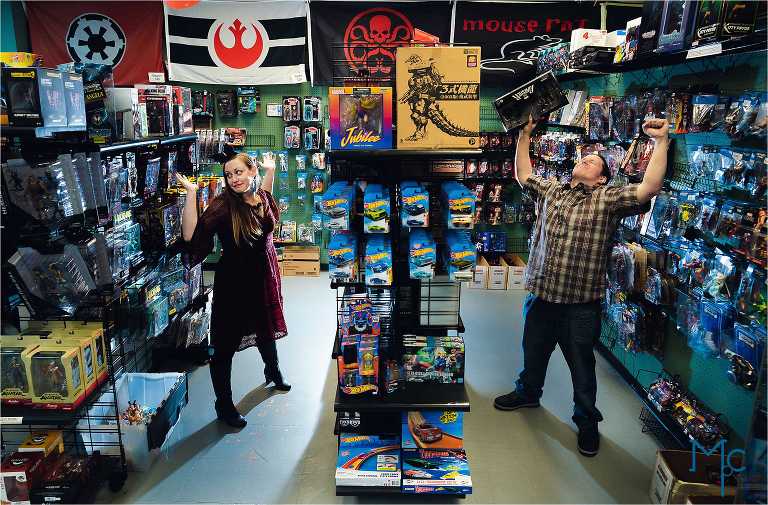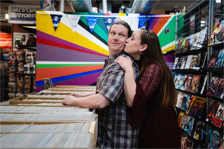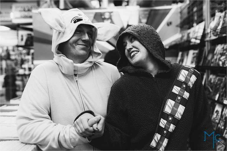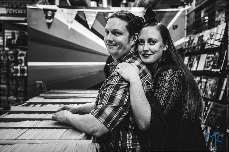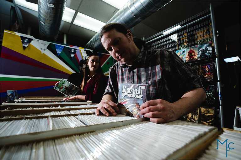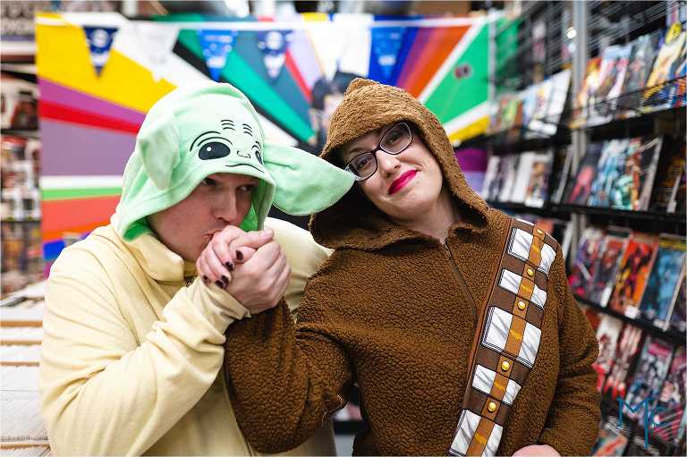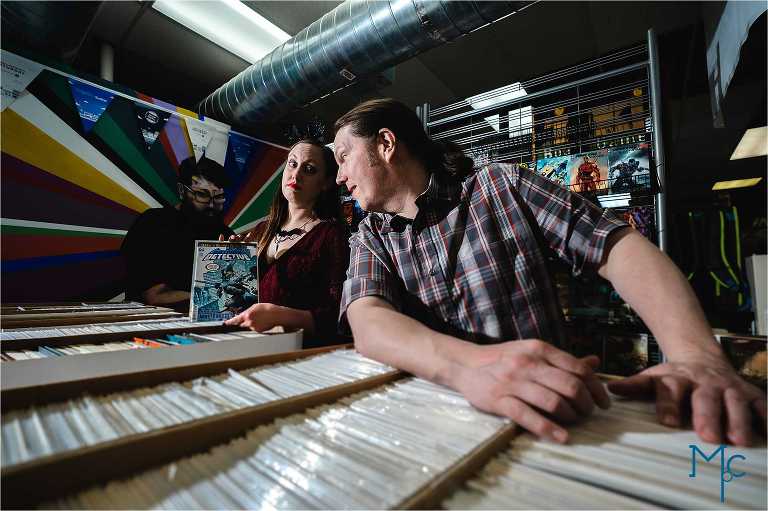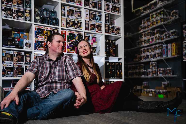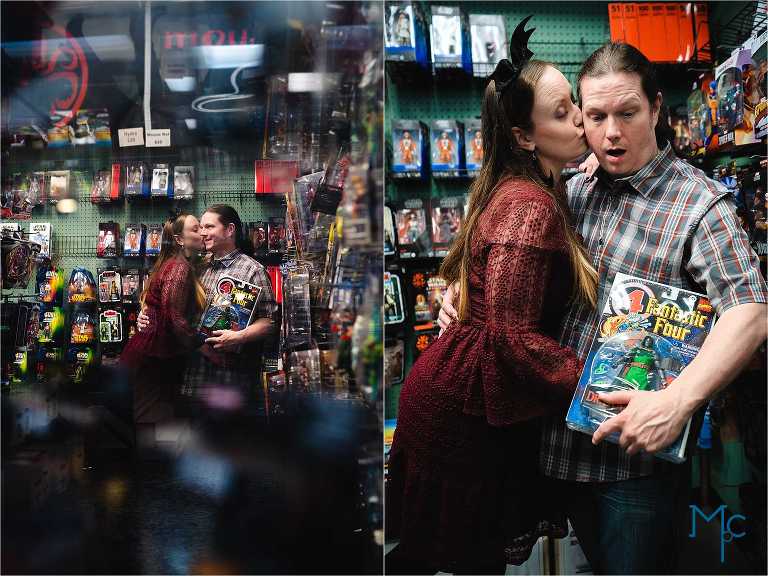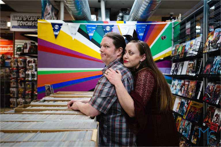 Matt & Roni’s story begins with friends, puns, and pubs. Initially meeting and not making the biggest impression, they still had mutual friends and then started working together which made it hard for them to miss each other. Through this constant interaction, they developed feelings and a Funko Pop collection for the ages (hence having their session at a game shop:). Matt proposed in front of both families at a dinner leaving Roni floored and happily engaged with a BEAUTIFUL amethyst ring.