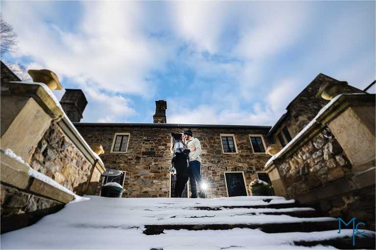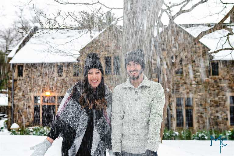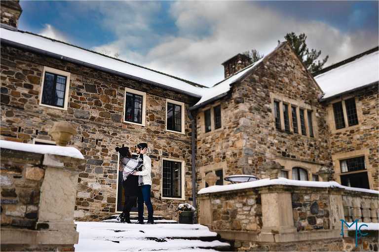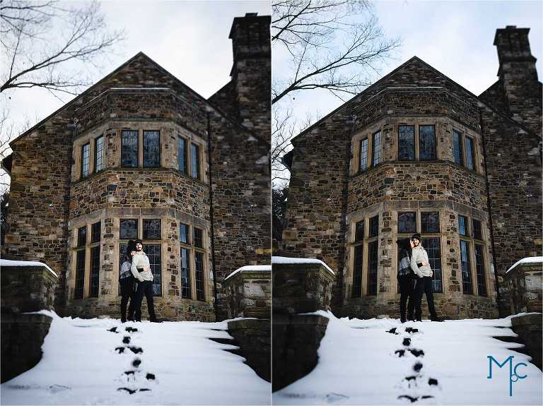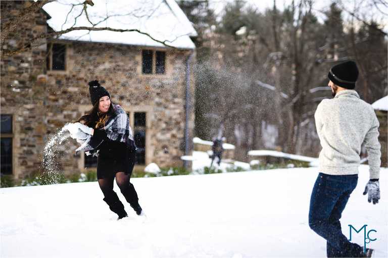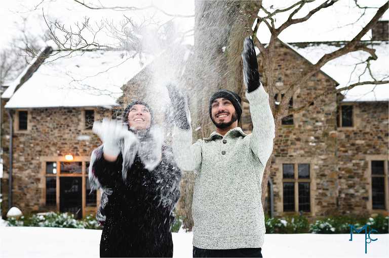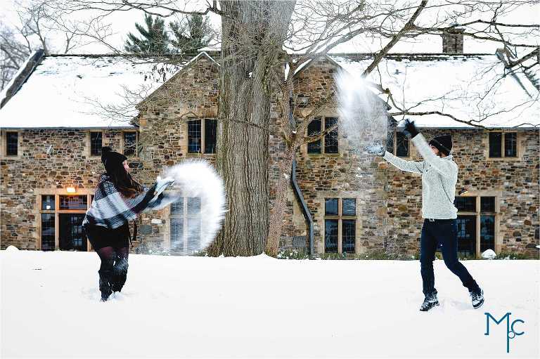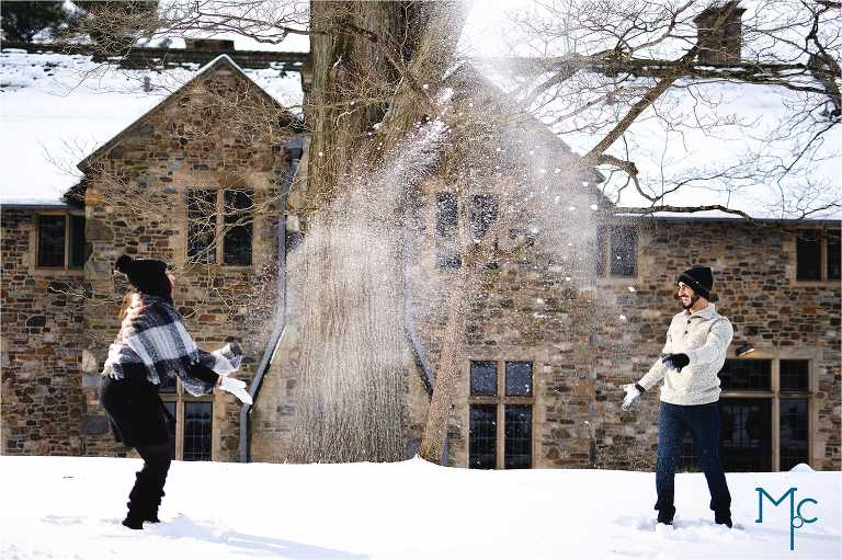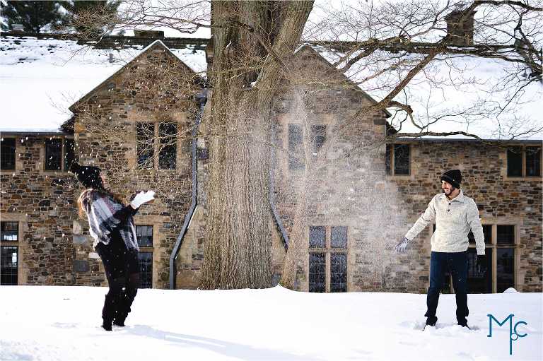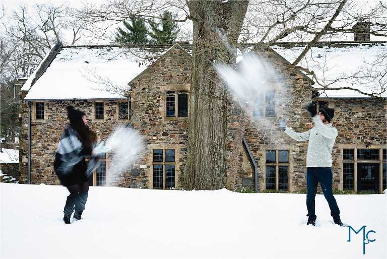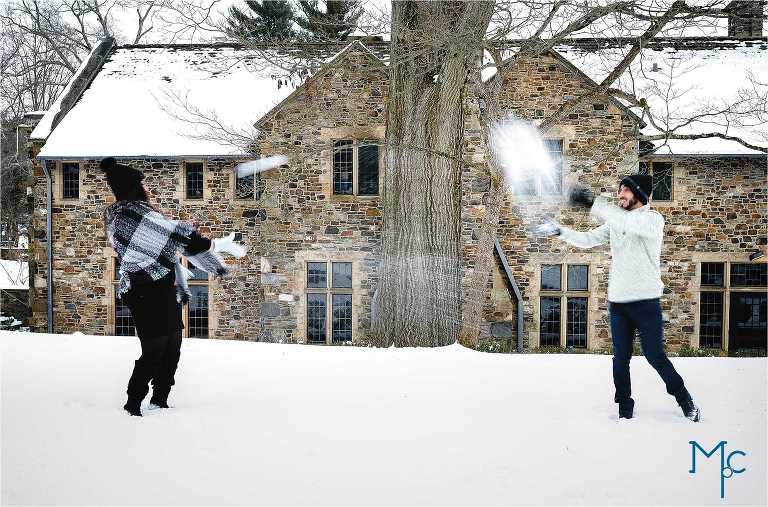 We were so excited to get to work with them under snowy conditions. Everything looked extra magical at a snow-blanketed Parque at Ridley Creek Manion. Starting out in the back of the house with the beautiful stonework, to a snowball fight to a little hike back further into the woods, we had a blast with Shoshana & Mike. We can not wait to celebrate your wedding day!
